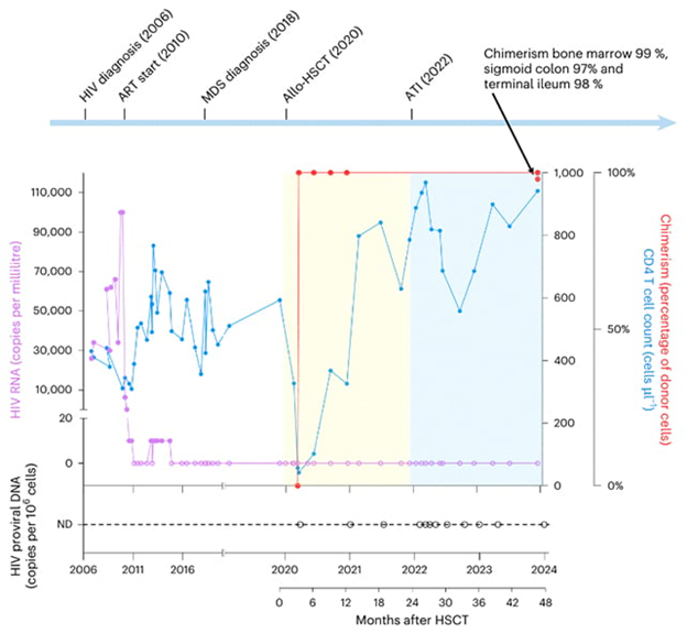 Ngày 13/03/2026, tạp chí Nature Microbiology công bố kết quả điều trị thành công cho một bệnh nhân tại Bệnh viện Đại học Oslo (Na Uy). Bệnh nhân nam 63 tuổi, được chẩn đoán nhiễm HIV vào năm 2006 (44 tuổi), đến năm 2010 ông bắt đầu được điều trị bằng liệu pháp kháng retrovirus (Antiretroviral therapy – ART) để ức chế khả năng nhân lên của virus trong cơ thể. Việc điều trị đã làm giảm lượng HIV trong máu bệnh nhân xuống mức không thể phát hiện. Tuy nhiên, năm 2017, bệnh nhân có triệu chứng mệt mỏi và số lượng tế bào máu giảm mạnh, đến tháng 1 năm 2018 thì được chẩn đoán hội chứng loạn sản tủy (myelodysplastic syndrome – MDS), một loại ung thư tủy xương làm các tế bào máu mới được tạo ra trong tủy xương không thể trưởng thành để thực hiện chức năng. Sau 2 năm điều trị, bệnh nhân dần không đáp ứng và tái phát, buộc các bác sĩ phải tìm cách ghép tủy xương (còn gọi là ghép tế bào gốc tạo máu, dùng các tế bào gốc khỏe mạnh từ người hiến vào cơ thể người bệnh để thay thế hệ thống tạo máu).