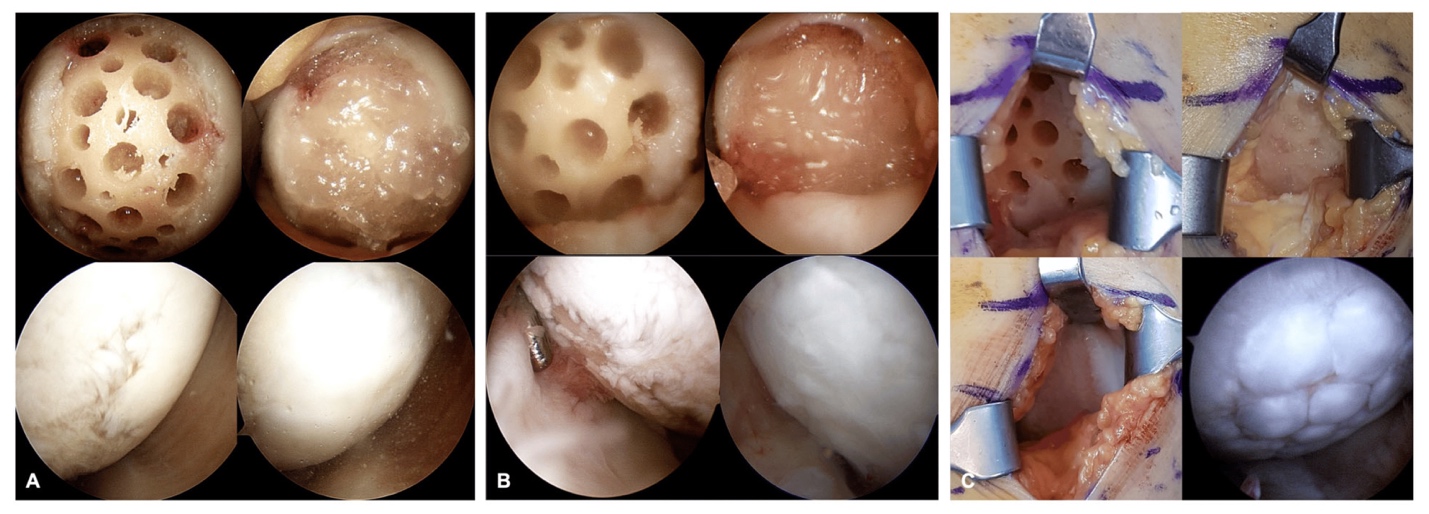 (A) Một trường hợp có điểm ICRS là 12, thuộc loại I – “bình thường”. (B) Một trường hợp có điểm đánh ICRS là 9, thuộc loại II – “gần bình thường”. (C) Một trường hợp có điểm ICRS là 5, thuộc loại II, được đánh giá “bất thường”. Các hình ảnh: phẫu thuật cắt xương chày cao (hình trên – trái), cấy ghép MSC-HA (hình trên, phải), hình ảnh nội soi khớp sau điều trị (dưới).