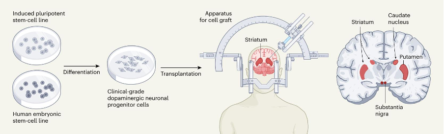 Các tế bào gốc đa tiềm năng như tế bào gốc đa tiềm năng cảm ứng (Induced pluripotent stem cell) và tế bào gốc phôi (embryonic stem cell) có khả năng phân chia vô hạn và biệt hóa thành bất kỳ loại tế bào nào trong cơ thể. Chúng được biệt hóa thành tế bào tiền thân của tế bào thần kinh sản xuất dopamine ở cấp độ sử dụng trong lâm sàng, sau đó được cấy ghép vào não ở vị trí nhân bèo hay bèo sẫm (putamen), là vùng kết hợp với nhân đuôi (caudate nucleus) để tạo nên vân não (striatum). Vân não kết nối với vùng đen (substantia nigra), là nơi mất tế bào thần kinh sản xuất dopamine nghiêm trọng nhất.