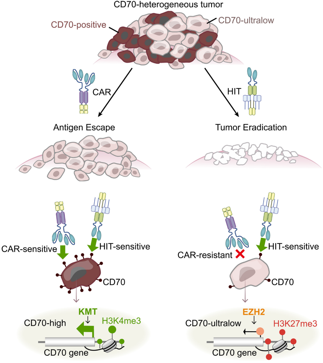 Trong các khối u đặc, tế bào CAR-T nhắm đích CD70 tiêu diệt các tế bào ung thư dương tính với thụ thể này, nhưng không loại bỏ hoàn toàn được chúng. Các tế bào ung thư thoát điều trị dường như âm tính với CD70, thực ra biểu hiện thụ thể này ở mức độ cực thấp mà các xét nghiệm thông thường và các tế bào CAR thường được sử dụng không thể phát hiện. Tuy nhiên, liệu pháp HIT có độ nhạy cao hơn có thể nhận biết và loại bỏ hoàn toàn các tế bào trên, đạt được sự tiêu diệt khối u hoàn toàn. Sự điều hòa biểu hiện CD70 do cơ chế di truyền ngoại gen (epigenetic), với sự trimethyl hóa lysine 27 trên histon H3 (H3K27me3).