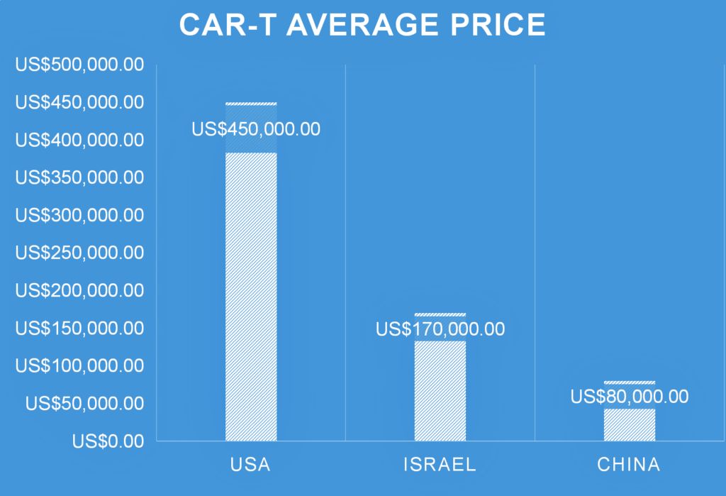 Trong các sản phẩm CAR-T được cấp phép trên thế giới, 7 sản phẩm được phê duyệt tại Hoa Kỳ và Châu Âu có chi phí khá cao, ngược lại những sản phẩm tại Ấn Độ và Trung Quốc ở mức giá được coi là thấp hơn nhiều. Ví dụ, Relma-cel khoảng 1 triệu Nhân dân tệ (khoảng 140.000 USD), Zevor-cel khoảng 160.000 USD, NexCAR19 khoảng 50.000 USD. Mức chi phí thấp do nhiều nguyên nhân, bao gồm chi phí xây dựng cơ sở sản xuất, trang thiết bị, nguyên liệu, và đặc biệt là chi phí nhân công cũng như công nghệ tạo vector chuyển gen của từng công ty.