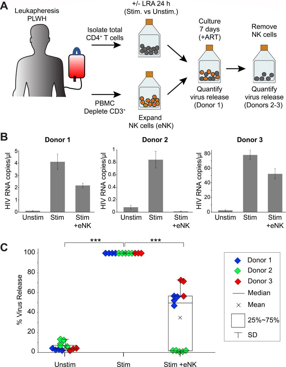 (A) Sơ đồ phát hiện khả năng tiêu diệt của eNK bằng sự giải phóng virus. Tế bào T CD4+ từ người nhiễm HIV điều trị với ART được phân lập từ tế bào đơn nhân (PBMC) và được hoạt hóa bằng tác nhân đảo ngược trạng thái tiềm ẩn (LRA) trong 24 giờ. Song song đó, tế bào NK được tách từ PBMC bằng cách loại bỏ CD3 và được nhân nuôi thành tế bào eNK. Nuôi cấy đồng thời tế bào T CD4+ đã hoạt hóa với tế bào eNK tự thân và ủ trong 7 ngày trong môi trường nuôi cấy có chứa thuốc kháng retrovirus. Sau khi nuôi cấy, dịch nổi được thu thập để đo sự giải phóng virus (Người hiến 1). Đối với Người hiến 2 và 3, tế bào eNK được lấy ra vào ngày thứ 7 và ủ thêm 7 ngày nữa trước khi thu thập dịch nổi. (B) Sự giải phóng virus bởi tế bào T CD4+ từ người nhiễm HIV sau khi điều trị bằng tế bào eNK. Biểu đồ cột thể hiện số bản sao RNA HIV/μL đối với tế bào T CD4+ không được kích thích (Unstim), được kích thích riêng lẻ (Stim) hoặc cùng với tế bào eNK (Stim+eNK) từ mỗi người hiến. (C) Tỷ lệ phần trăm giải phóng virus được chuẩn hóa theo tế bào T CD4+ được kích thích (Stim), so sánh với tế bào T CD4+ được kích thích cùng với tế bào eNK (Stim+eNK) và tế bào T CD4+ không được kích thích (Unstim).