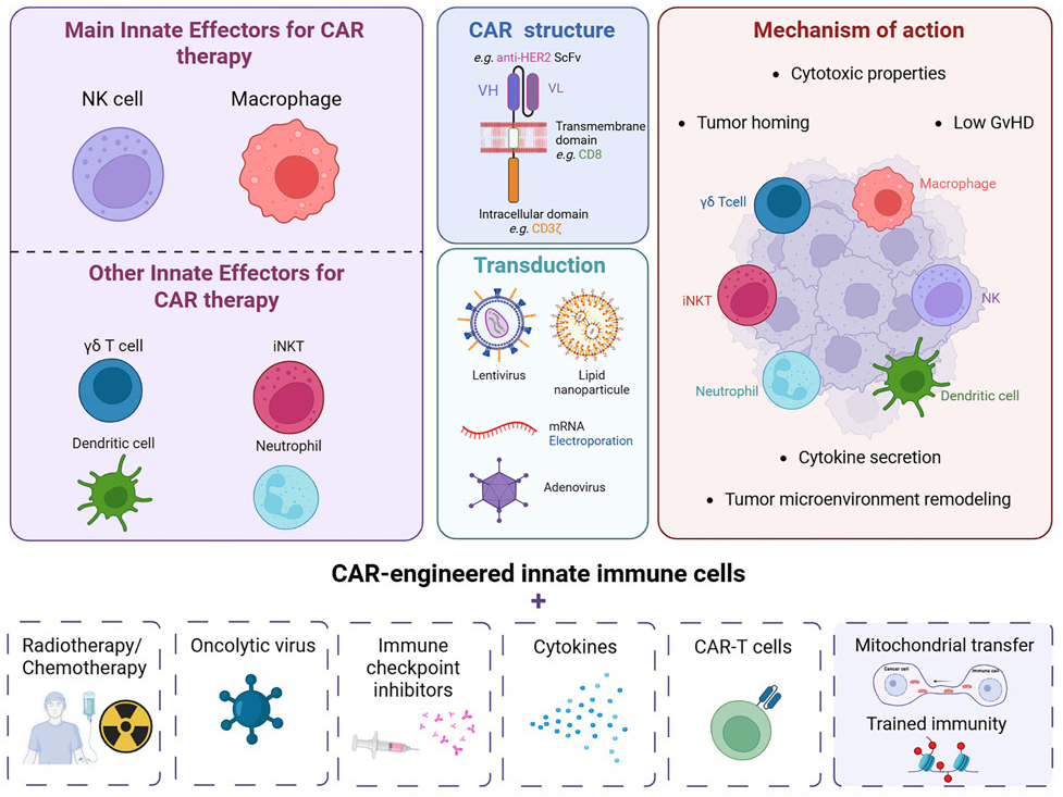 Những tế bào này kết hợp cùng CAR đang được nghiên cứu để tăng cường khả năng nhắm đích khối u và độc tính tế bào. Do độc lập với MHC, các sản phẩm này có thể sản xuất hàng loạt để sử dụng đồng loại, giảm tính phức tạp của quy trình tự thân (như đối với CAR-T) và chi phí sản xuất thấp hơn. Chúng cũng cho thấy tỷ lệ độc tính thần kinh và hội chứng giải phóng cytokine thấp hơn CAR-T. Mỗi loại tế bào miễn dịch bẩm sinh đều có những đặc điểm sinh học độc đáo để cải thiện liệu pháp CAR, tạo nên những hướng đi đầy hứa hẹn cho thế hệ tiếp theo của công nghệ này.