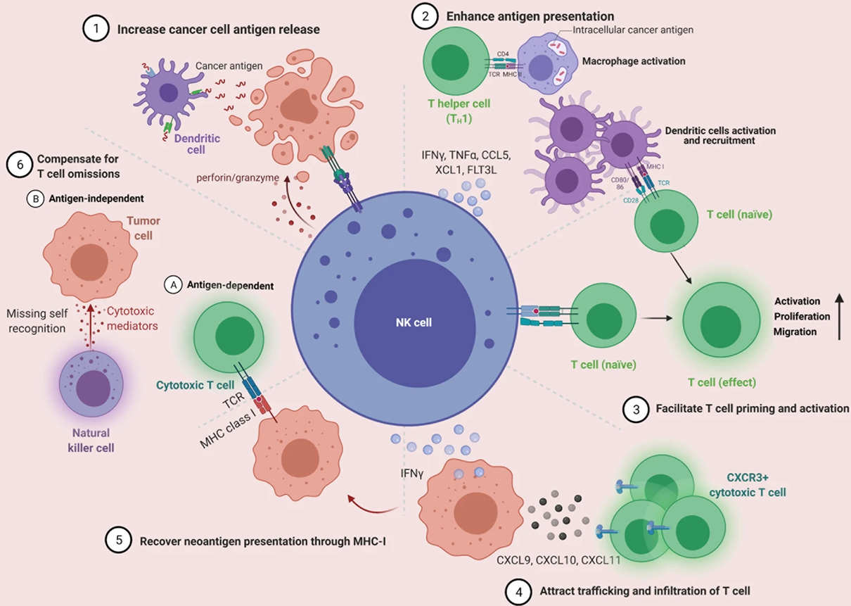 Các tế bào NK được hoạt hóa làm tăng sự giải phóng kháng nguyên của tế bào ung thư, tăng cường trình diện kháng nguyên, tạo điều kiện thuận lợi cho việc kích thích và hoạt hóa tế bào T, thu hút sự di chuyển và xâm nhập của tế bào T, phục hồi sự trình diện kháng nguyên mới và bù đắp cho sự thiếu hụt tế bào T.