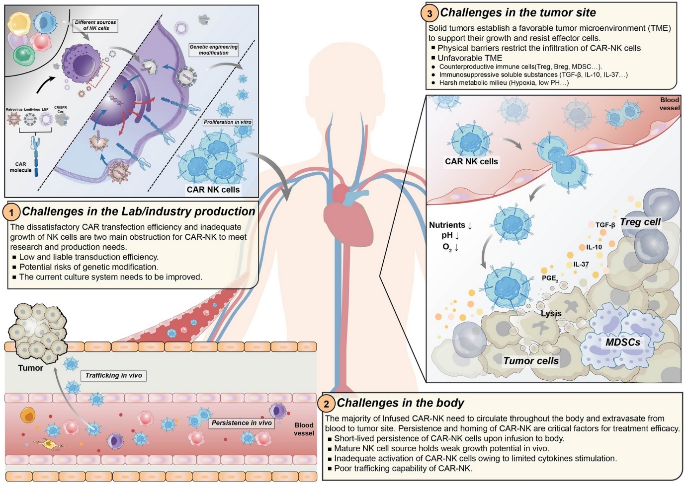 Bên cạnh đó, vi mô trường khối u (tumor microenvironment – TME) gây nên những rào cản để CAR-NK có thể tiếp cận các tế bào ung thư trong u đặc. Mặc dù có lợi thế hơn nhiều so với CAR-T, các tế bào CAR-NK vẫn cần được tăng cường khả năng thâm nhập mô và thích ứng với TME. Một số phương án khắc phục đang được thử nghiệm, bao gồm kết hợp CAR-NK với các chất ức chế điểm kiểm soát miễn dịch, sửa đổi gen để cải thiện khả năng thích ứng, những can thiệp trong quá trình điều trị để thay đổi TME như khắc phục tình trạng thiếu oxy và pH thấp,…