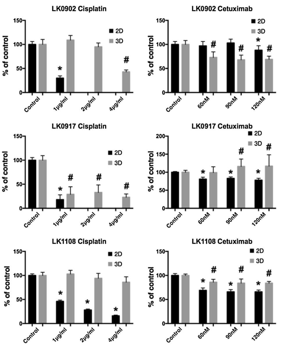 - Tùy dòng tế bào mà khả năng đáp ứng thuốc cetuximab (thuốc hướng đích EGFR) khác nhau (tốt hơn hoặc kém hơn) giữa mô hình 2D và 3D, thể hiện ở số tế bào còn lại sau điều trị cetuximab khác nhau ở hai mô hình (Hình 3)