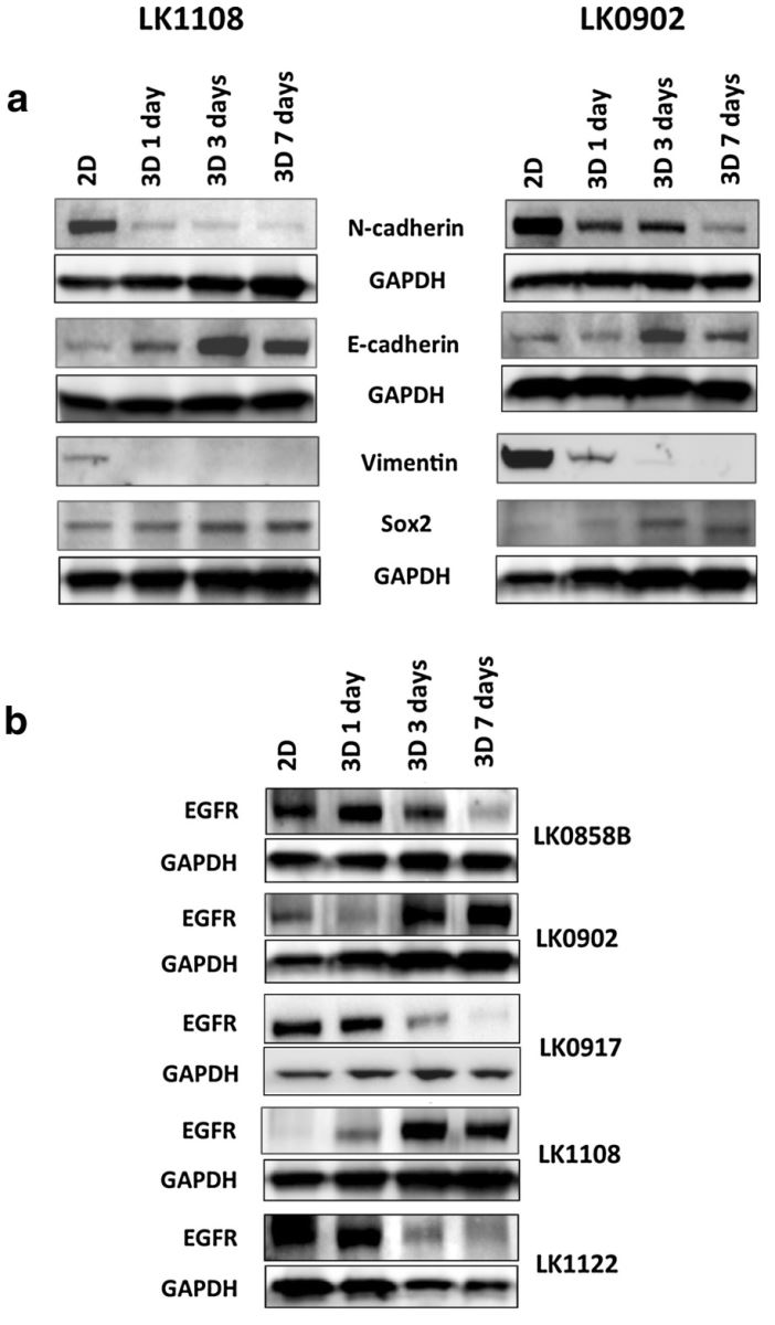 - Sự biểu hiện EGFR (thụ thể yếu tố tăng trưởng biểu bì, liên quan đến khả năng đáp ứng thuốc điều trị đích cetuximab) có sự khác biệt khi nuôi cấy 2D và 3D, tùy theo từng dòng tế bào (Hình 2B, đánh giá bằng Western Blot).