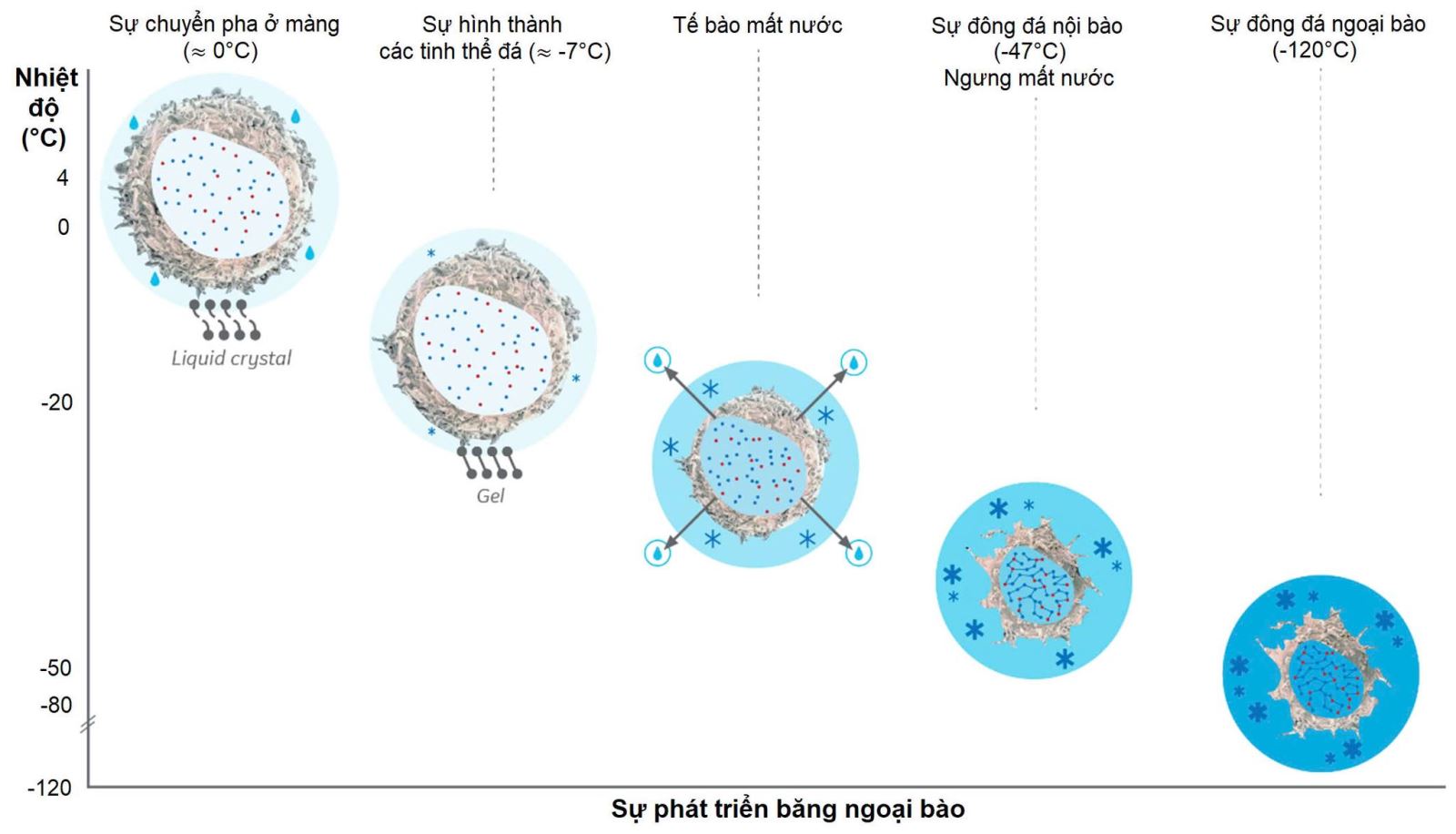 - Ở khoảng -7*C, băng bắt đầu hình thành trong khoang ngoại bào và khi tinh thể băng phát triển, nồng độ chất tan ngoại bào tăng lên, nước nội bào thoát ra khỏi tế bào theo áp suất thẩm thấu.