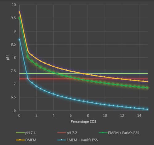 - Riêng DMEM có nồng độ bicarbonate là 44 mM, khi đó để duy trì pH 7,2 – 7,4 thì tỷ lệ CO2 thích hợp là 7,5% – 11% trong không khí. Với CO2 ở mức 5%, pH của DMEM là 7,5, là giá trị chấp nhận được nhưng thực tế nằm ngoài phạm vi pH tối ưu (hình minh họa).