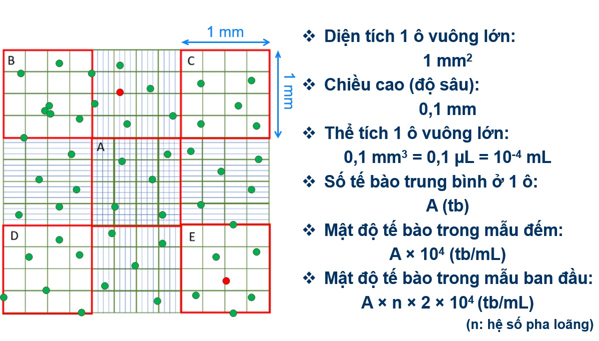 + Nên pha loãng mẫu sao cho mỗi ô vuông nhỏ có khoảng 5-10 tế bào (trung bình không ít hơn 2,5 tế bào), mỗi ô vuông lớn có khoảng 10-50 tế bào