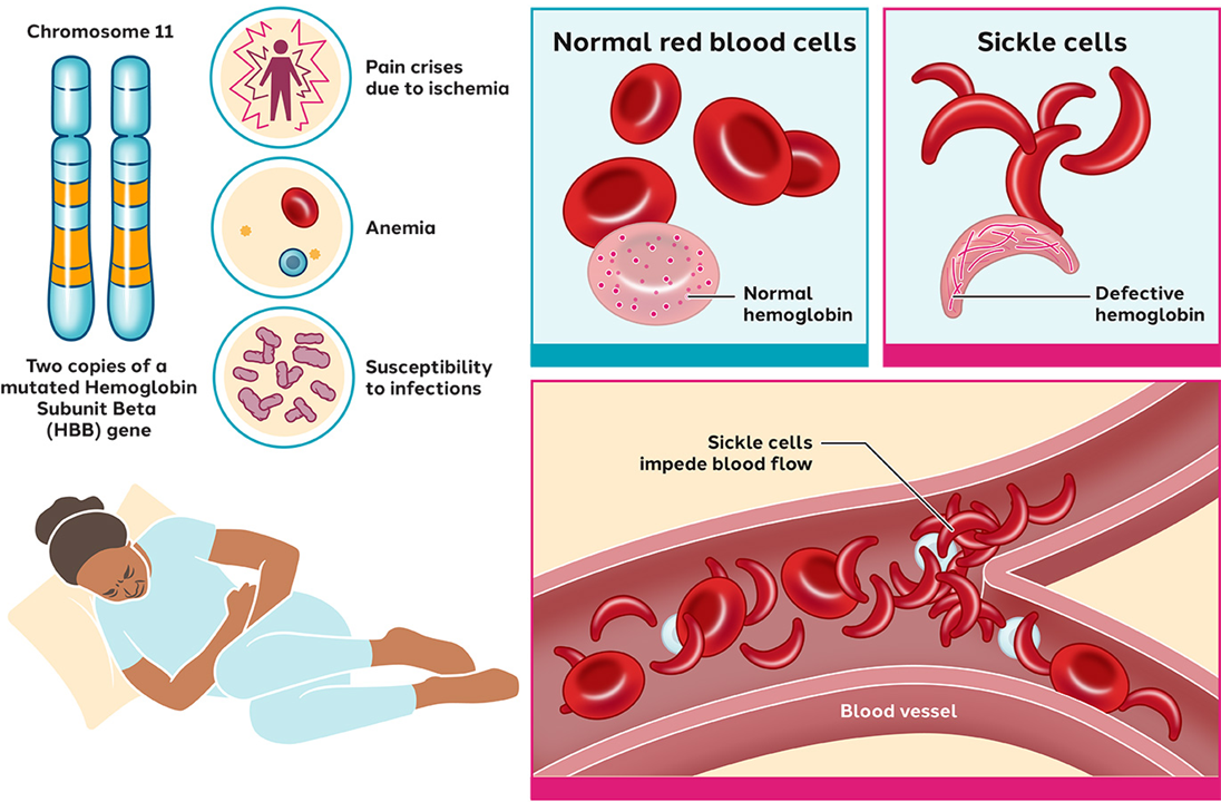 Bệnh hồng cầu hình liềm (Sickle Cell Disease) gây ra bệnh thiếu máu tán huyết mạn tính, là một dạng thiếu máu di truyền do không có đủ các tế bào hồng cầu khỏe mạnh để mang đầy đủ oxy trong cơ thể người bệnh. Đây là một rối loạn di truyền do đột biến gen hemoglobin gây ra, dẫn đến protein hemoglobin (huyết sắc tố, thành phần quan trọng của hồng cầu) bị lỗi, làm biến đổi các tế bào hồng cầu mềm dẻo thành các tế bào cứng, có hình liềm. Các tế bào này dễ bị vỡ, ngưng kết với nhau gây tắc mạch, dẫn đến các cơn đau dữ dội và thiếu máu cục bộ cơ quan. Các cơn tan máu trầm trọng ngày càng thường xuyên, gây nên các biến chứng như nhiễm trùng, bất sản tủy xương, hoặc bệnh phổi có thể phát triển nghiêm trọng gây tử vong. Các phương pháp điều trị bao gồm chống nhiễm trùng (tiêm phòng, thuốc kháng sinh), giảm đau, Hydroxyurea (kích thích sản xuất huyết sắc tố bào thai), truyền máu, cấy ghép tủy xương,…