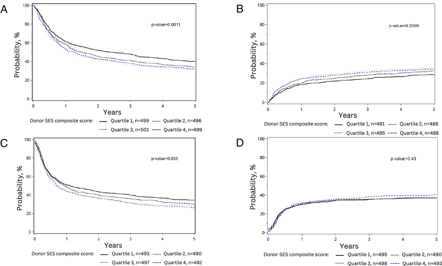 Nghiên cứu hồi cứu được thực hiện trên 2.005 bệnh nhân ung thư máu được điều trị bằng ghép tế bào gốc tạo máu ở 125 bệnh viện tại Hoa Kỳ, thời gian theo dõi là 120 tháng. Với việc phân tầng tương đối đồng đều các đối tượng nghiên cứu thành 4 nhóm, nghiên cứu đã chỉ ra những bệnh nhân được nhận tế bào từ người hiến có kinh tế xã hội ở nhóm khó khăn nhất đã giảm 9,7% tỷ lệ sống toàn trạng và tăng 6,6% tỷ lệ tử vong liên quan đến cấy ghép trong ba năm so với nhóm nhận tế bào từ người hiến có kinh tế xã hội ở nhóm tốt nhất. Kết quả này phù hợp với những nghiên cứu trước đây liên quan đến sự bất lợi về kinh tế xã hội với chức năng tế bào miễn dịch và quá trình tạo máu bị thay đổi, chúng thực sự tồn tại dai dẳng ngay cả khi tế bào được chuyển vào môi trường vật chủ mới (người được hiến tặng).