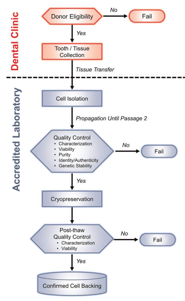 - Thu thập mẫu: Người hiến cần được vệ sinh răng miệng, răng sau khi thu thập được đưa ngay vào dung dịch chuyên dụng để đảm bảo tủy được bảo tồn. Nhiều ngân hàng khuyến cáo cần nhổ răng ngay khi mới lung lay, nhiều ngân hàng khác chấp nhận việc để răng rụng tự nhiên.