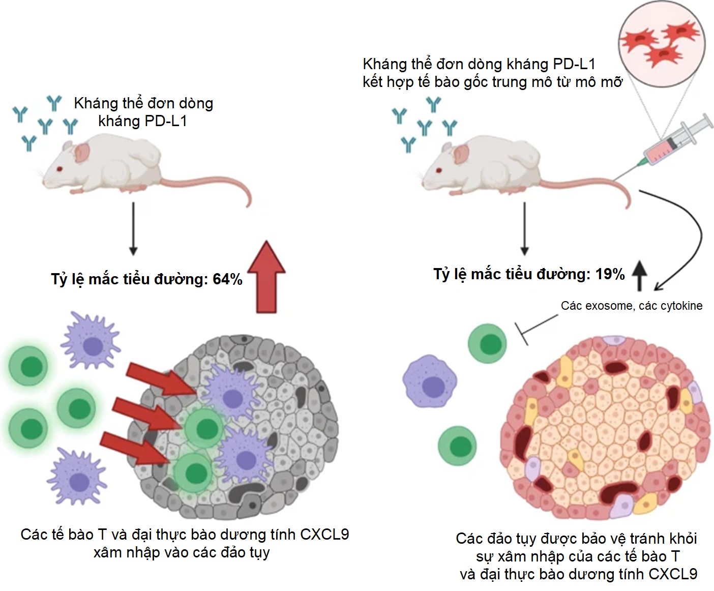 Theo một nghiên cứu đại Đại học Osaka (Nhật Bản), các nhà khoa học đã chứng minh MSC có tiềm năng điều trị chống lại tác dụng phụ gây tiểu đường type 1 của các thuốc ức chế điểm kiểm soát miễn dịch khi điều trị ung thư. Họ kích thích gây bệnh tiểu đường ở chuột bằng cách sử dụng kháng thể đơn dòng kháng PD-L1, sau đó tiêm MSC từ mô mỡ người và phân tích các tế bào miễn dịch trong dịch tiết tuyến tụy. Ở nhóm chuột tiêm MSC, tỷ lệ mắc tiểu đường chỉ là 19%, so với 64% ở nhóm đối chứng không sử dụng MSC. Các kháng thể đơn dòng ức chế tương tác giữa PD-1 và PD-L1 gây ra những biến đổi trong hệ thống miễn dịch, đáng chú ý nhất là sự tích tụ các tế bào miễn dịch (đặc biệt là đại thực bào) trong các tụy đảo Langerhans, làm gián đoạn quá trình sản xuất insulin. Những tế bào MSC được tiêm vào giúp điều hòa ngăn chặn những tế bào miễn dịch này, nhờ đó các tụy đảo tránh được sự tấn công của hệ thống miễn dịch và sản xuất insulin bình thường.