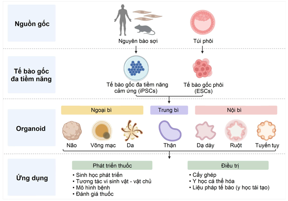 • Phát triển thuốc: Sử dụng iPSCs biệt hóa thành các loại tế bào chuyên hóa để tạo nên organoid (các cơ quan mini trong phòng thí nghiệm) để thử thuốc, giúp nghiên cứu tác động của thuốc đến các cơ quan trong cơ thể một cách chính xác hơn so với trước đây sử dụng nuôi cấy tế bào 2D hoặc mô hình động vật.