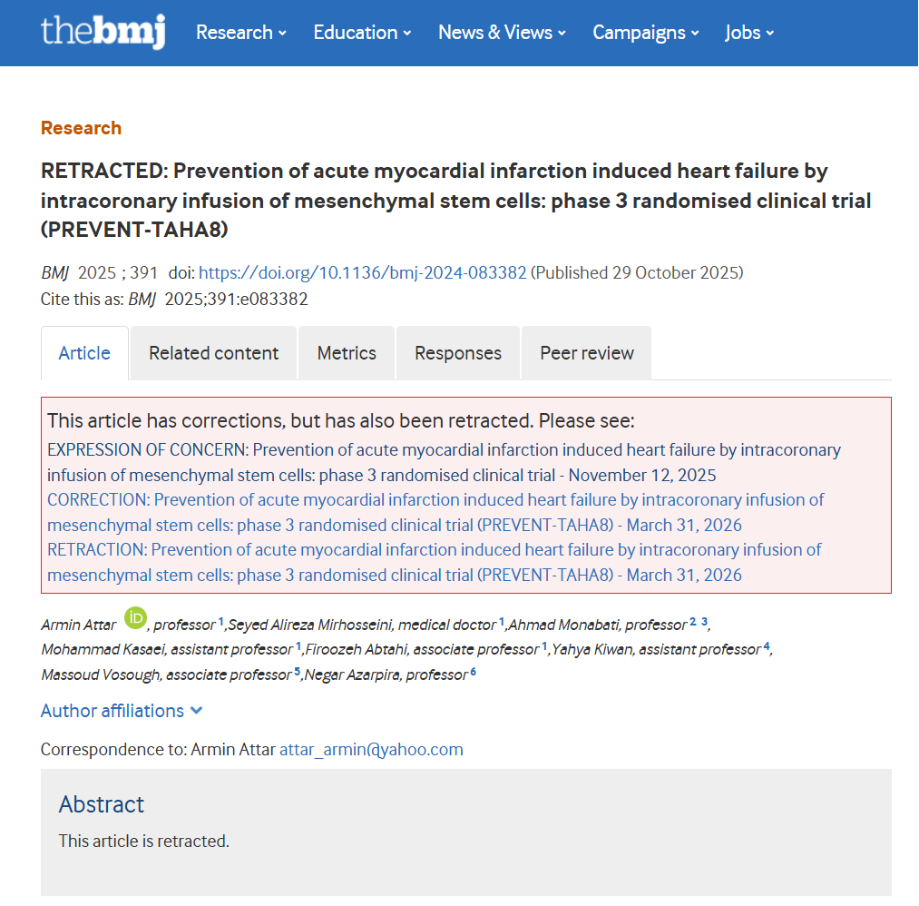 2. RETRACTION: Prevention of acute myocardial infarction induced heart failure by intracoronary infusion of mesenchymal stem cells: phase 3 randomised clinical trial (PREVENT-TAHA8). The BMJ 2026;392:s579. https://doi.org/10.1136/bmj.s579