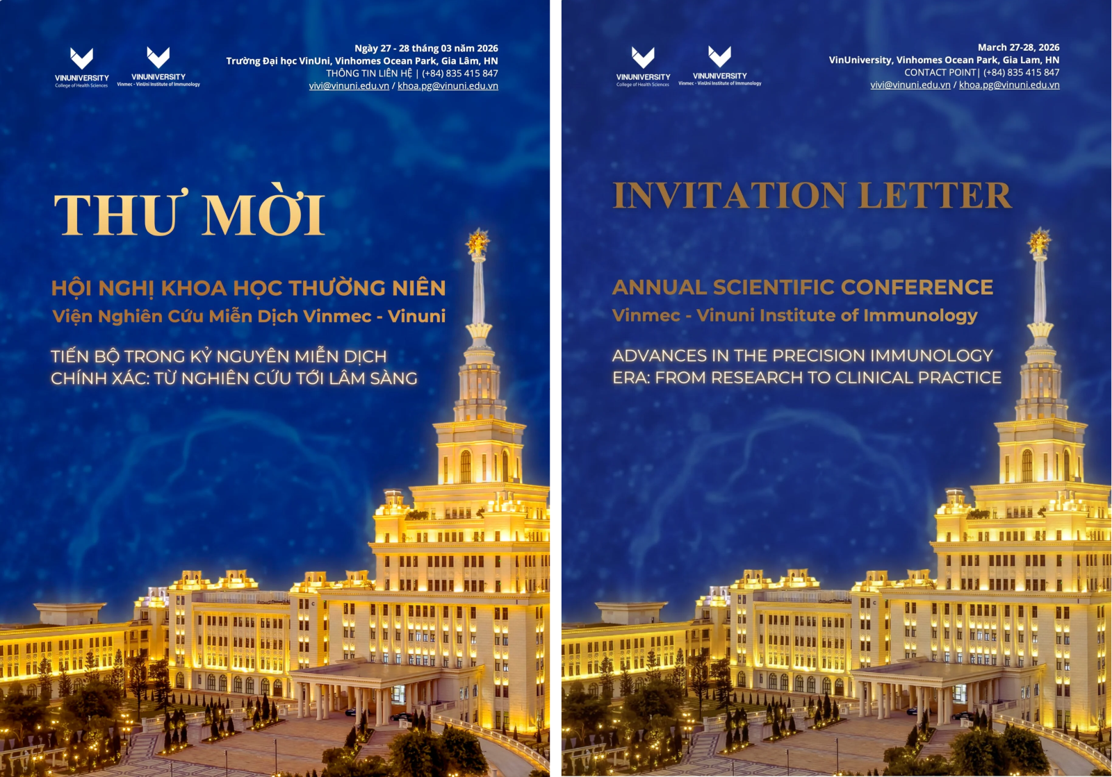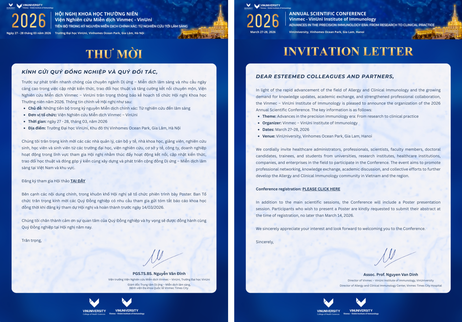 Hội nghị Khoa học thường niên năm 2026 của Viện Nghiên cứu Miễn dịch Vinmec – VinUni sẽ diễn ra ngày 27 - 28/3/2026, nơi các nhà khoa học, chuyên gia và nghiên cứu trẻ cùng trao đổi kiến thức và cập nhật những tiến bộ mới nhất trong lĩnh vực miễn dịch và y học. Đây là dịp tuyệt vời để kết nối, học hỏi và thúc đẩy nghiên cứu Việt Nam vươn tầm quốc tế.