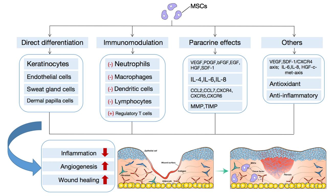 Y học tái tạo, đặc biệt là liệu pháp dựa trên tế bào gốc, có thể mang lại hy vọng mới trong điều trị hội chứng bức xạ qua da (cutaneous radiation syndrome – CRS). Một phương pháp đầy hứa hẹn là liệu pháp tế bào gốc trung mô (mesenchymal stem/stromal cell – MSC) trưởng thành để thúc đẩy quá trình tái tạo mô, giúp phục hồi làn da bị tổn thương và trẻ hóa các vùng bị ảnh hưởng, giảm bớt các triệu chứng thể chất và nâng cao sức khỏe tinh thần cho bệnh nhân. Hy vọng cải thiện những vấn đề này dựa trên các đặc tính của tế bào gốc trung mô, như khả năng di chuyển đến các mô bị tổn thương, điều chỉnh phản ứng miễn dịch và viêm, thúc đẩy sự sống còn của tế bào và sửa chữa mô, kích thích quá trình hình thành mạch máu mới,…
