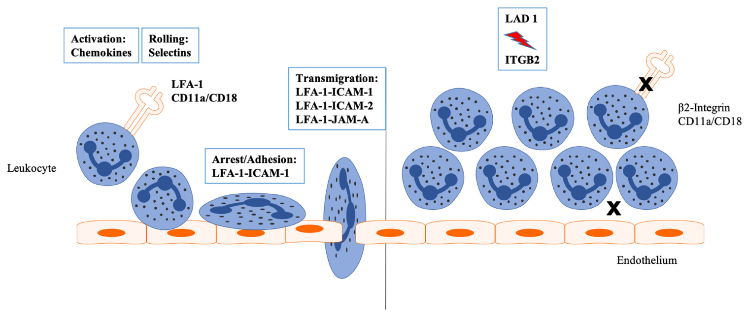 Tình trạng viêm dẫn đến sự hoạt hóa nội mô, integrin β2 tương tác với các protein như ICAM-1 và ICAM-2 giúp bạch cầu bám dính vào nội mô bị viêm, di chuyển xuyên qua thành mạch để tham gia phản ứng miễn dịch. Trong LAD-1, sự thiếu hụt hoặc biểu hiện khiếm khuyết của integrin β2 dẫn đến sự dính và di chuyển xuyên thành mạch của tế bào bạch cầu bị giảm mạnh.