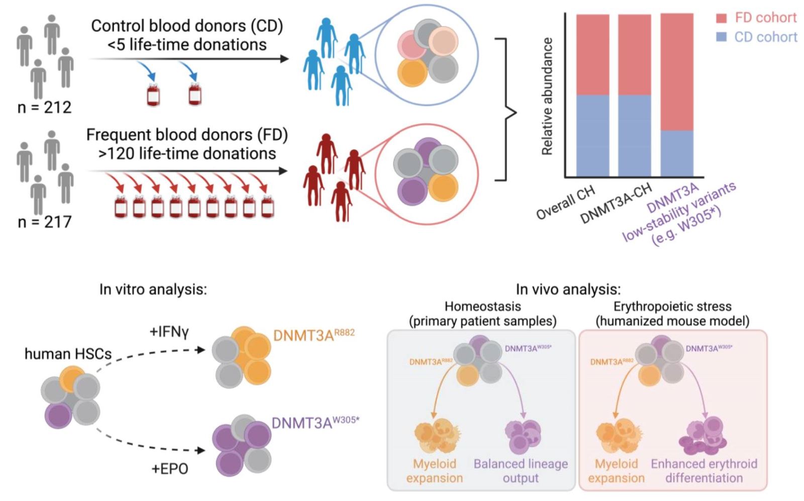 Khi mọi người hiến máu, các tế bào gốc trong tủy xương sẽ tạo ra các tế bào máu mới để thay thế lượng máu đã mất, động lực này thúc đẩy quá trình chọn lọc các bản sao di truyền nhất định. Các nhà khoa học đã phân tích các mẫu máu từ hơn 200 người hiến máu thường xuyên (3 lần/năm trong hơn 40 năm) và những người hiến máu đối chứng không thường xuyên (tổng cộng dưới 5 lần). Các mẫu từ cả hai nhóm cho thấy mức độ đa dạng về dòng vô tính tương tự nhau, nhưng thành phần quần thể máu khác nhau: cả hai nhóm đều chứa các bản sao có sự biến đổi gen DNMT3A, trong đó những biến đổi ở người hiến máu thường xuyên nằm ở những vùng được xác định không liên quan đến bệnh bạch cầu.