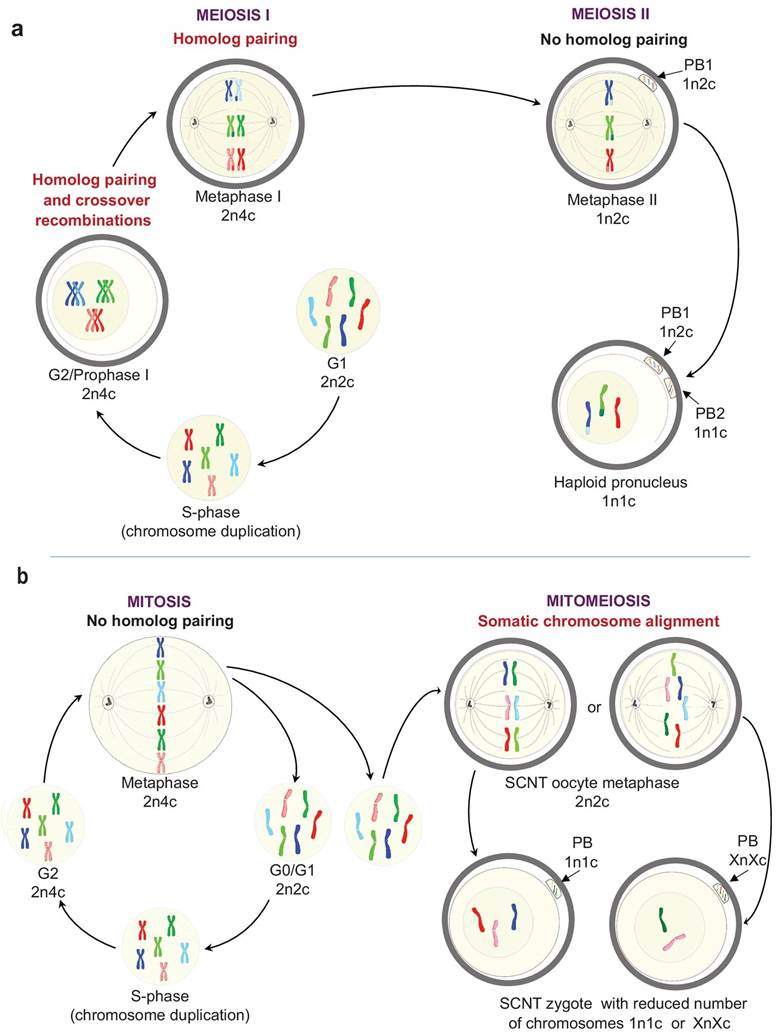 (A) Quá trình giảm phân: tế bào 2n (pha G1) tự nhân đôi nhiễm sắc thể thành 2n kép (pha S), sau đó phân chia thành hai tế bào (một trứng và một thể cực – ký hiệu PB1), mỗi tế bào n nhiễm sắc thể kép (giảm phân I, hình trái), tế bào trứng n kép tiếp tục phân ly nhiễm sắc thể tạo nên hai tế bào (một trứng trưởng thành và một thể cực – kỹ hiệu PB2). (B) Quá trình nguyên phân (bên trái) ở tế bào soma, ví dụ tế bào da: tế bào 2n (pha G1) tự nhân đổi nhiễm sắc thể thành 2n kép (pha S), sau đó phân ly tạo thành hai tế bào, mỗi tế bào mang 2n nhiễm sắc thể đơn. Quá trình nguyên giảm phân (bên phải): tế bào soma 2n đơn được cấy vào trứng đã loại nhân (lúc này trứng thông thường đang bị giữ ở kỳ giữa của giảm phân II), nên tế bào trứng này tiếp tục đi vào phân chia “nguyên giảm phân”, giống lần phân bào II của giảm phân, kết quả là tạo ra tế bào bình thường với n nhiễm sắc thể đơn, hoặc các dạng bất thường dị bội như n–1, n–2, n+1, n+2,…