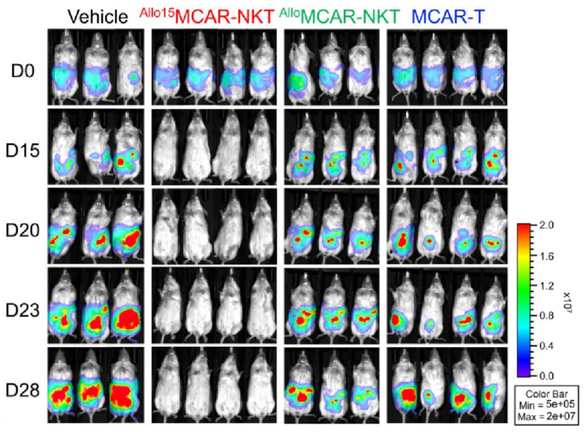 Hình ảnh phát quang sinh học cho thấy sự hiện diện của tế bào khối u ở chuột thí nghiệm theo thời gian, chứng minh hiệu quả kháng u trên mô hình chuột NSG (NOD scid gamma mouse) cấy ghép khối u biểu mô nội mạc tử cung người HEC1B-MSLN-FG. Ba loại tế bào điều trị được sử dụng: AlloMCAR-NKT (CAR-NKT đồng loại hướng đích mesothelin), Allo15MCAR-NKT (CAR-NKT đồng loại hướng đích mesothelin, có IL-15 kích hoạt) và tế bào MCAR-T thông thường (CAR-T hướng đích mesothelin). Liều tiêm phúc mạc là 3 × 106 tế bào.