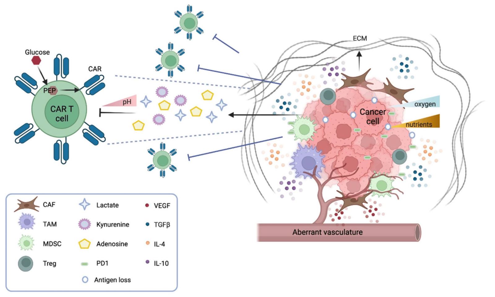 Các tế bào ung thư giảm điều hòa kháng nguyên của chúng và biểu hiện các phân tử ức chế điểm kiểm soát miễn dịch (PD-1 và các phân tử khác). Chúng cũng tiết các chất chuyển hóa ức chế chức năng của tế bào CAR-T như kynurenine, adenosine và lactate. Các tế bào ung thư thu gom các chất dinh dưỡng cần thiết cho chức năng của tế bào CAR-T (VD: glucose). Các bạch cầu ức chế miễn dịch cũng tham gia vào việc làm giảm chức năng của tế bào CAR-T, như các đại thực bào liên quan đến khối u (TAM), các tế bào ức chế có nguồn gốc tủy (MDSC) và các tế bào T điều hòa (Treg) tiết ra các cytokine (TGFb, IL-4, IL-10) ức chế hoạt hóa tế bào CAR-T. N goài ra, VEGF kích thích hình thành mạch máu bất thường, góp phần tạo nên môi trường thiếu oxy, là điều kiện bất lợi cho tế bào CAR-T. Mô đệm ung thư cũng chứa các nguyên bào sợi liên quan đến ung thư (CAF) tiết ra các cytokine ức chế, kết hợp với chất nền ngoại bào (ECM) tạo thành rào cản vật lý ngăn chặn sự xâm nhập của tế bào CAR-T.